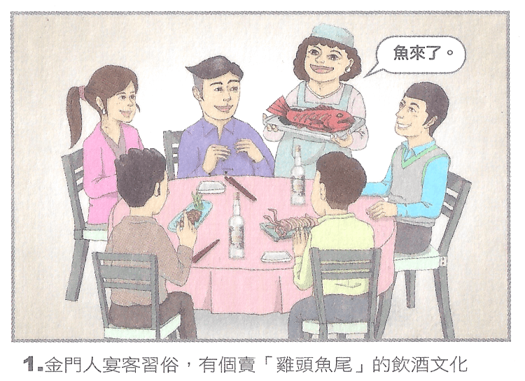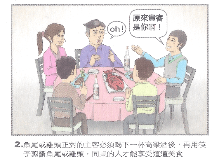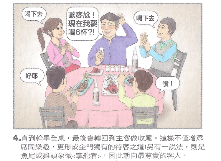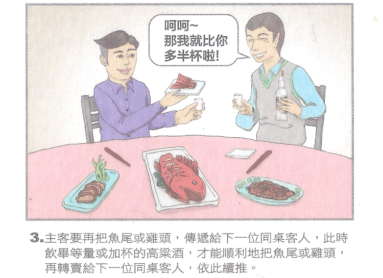 這是金門飯桌上一種特有的勸酒方式。這是在飯桌上,上了雞或魚時就要開始,被雞頭或魚尾對著的主客要先喝一杯高粱酒,再將它折斷夾下放進盤中。